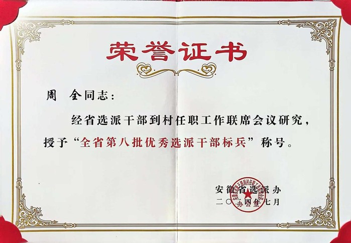 據悉,周全同志在第八批選派工作中連續三年年度考核優秀,并獲得任期考核優秀,被評為山頭鎮優秀黨員等榮譽。2024年,周全同志作為第九批選派駐村干部,繼續助力鄉村振興。