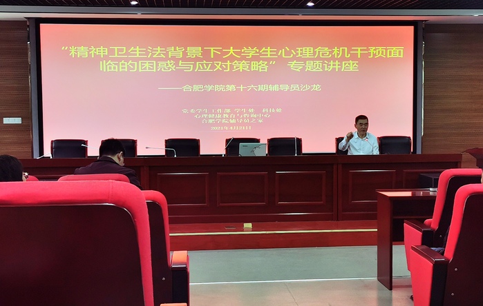 4月21日上午,我校在一期6號樓學術(shù)報告廳舉辦第十六期輔導員沙龍,中南大學心理健康教育與咨詢專家唐海波教授應邀為我校學工隊伍作“精神衛(wèi)生法背景下大學生心理危機干預面臨的困惑與應對策略”專題講座。各二級學院黨委書記、副書記,全體輔導員,學校心理健康教育與咨詢工作的專兼職老師等相關(guān)人員聆聽了本次講座。