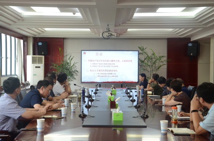 其后,校馬克思主義學院閃茜菁老師作了《汲取百年黨史偉力,奮力現代化新征程》的主題報告,報告分為中國共產黨百年歷史的主題與主線、主流與本質和社會主義現代化國家建設布局兩個部分,從中國共產黨誕生的國內國際背景、百年黨史的四個歷史階段、“十四五”規劃建議的邏輯主線、重點戰略等方面進行了系統講述。她指出:中國共產黨百年黨史的主線與主題——在馬克思主義指導下,為人民謀幸福,為民族謀復興。主流與本質——始終是馬克思主義政黨。黨的性質、初心和使命始終沒有變,始終堅持馬克思主義政黨的本色,始終堅持為人民謀幸福的宗旨,始終牢記并踐行實現中華民族偉大復興的使命。黨的十九屆五中全會對“十四五”時期我國經濟社會發展及社會主義現代化建設布局作出了清晰描述,概括為“三新”——新發展階段、新發展理念、新發展格局,推動高質量發展、統籌發展和安全、促進全體人民共同富裕。