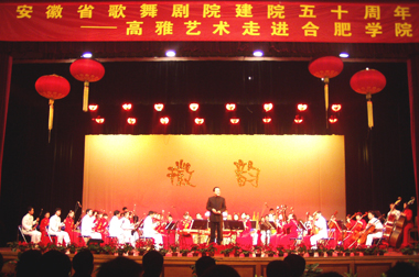 12月27日晚,安徽省歌舞劇院建院50周年――高雅藝術(shù)走進(jìn)合肥學(xué)院,《徽韻》專場民族音樂會在院南區(qū)禮堂隆重上演。國家一級指揮徐宏帶領(lǐng)安徽省歌舞劇院民族管弦樂團(tuán)為觀眾獻(xiàn)上了一場聽覺的盛宴。院長趙良慶、副院長鄭永紅等領(lǐng)導(dǎo)及千余名師生到場觀看了演出。