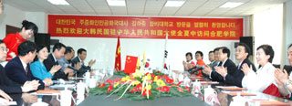 接著,金夏中大使來到禮堂,為我院近1500名師生作“攜手共創(chuàng)中韓關(guān)系美好未來”演講。金夏中大使在演講前幽默詼諧地解讀自己的名字說:“夏即華夏的夏,中即中國的中,說明我與中國很有緣分?!?002年,金夏中大使曾經(jīng)訪問過安徽,通過這次訪問,他覺得安徽的變化很大。他說,非常珍惜這次訪問機(jī)會,安徽出了很多名人,韓國與安徽的交流處于起步階段,想多走走看看,多了解安徽,安徽為中國的改革開放作出過很多貢獻(xiàn),也反映了安徽人民的精神。他在演講中從韓國的經(jīng)濟(jì)發(fā)展,韓劇《大長今》、《我的野蠻女友》等曾在中國流行的韓國電視劇談到韓國的飲食和電子、汽車工業(yè);從中國的滾滾“韓流”和韓國的陣陣“漢風(fēng)”談到韓中文化的交互融合;從他個(gè)人學(xué)習(xí)漢語和出任駐中國大使談到他與中國的不解之緣;從韓中的發(fā)展歷史談到中國國家主席胡錦濤訪問韓國時(shí)與韓國總統(tǒng)盧武鉉達(dá)成的共識“在政治上,中韓兩國應(yīng)該成為不同社會制度國家和平共處的典范?!?
