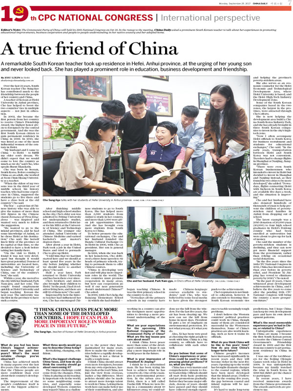 今天《中國日報》第7版A true friend of China,一個整版,講述韓國友人趙誠惠和她家人的“中國情結”。(宣傳部 國際交流合作處)