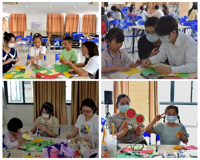 趣味折紙活動中,手工社社團成員對小朋友進行一對一輔導,孩子們認真地學習每一個步驟,一遍遍地重復著手勢,妙手翻飛之間,一把把形態各異的紙扇映入眼簾。活動結束后,小朋友們紛紛與自己的手工作品合影留念。