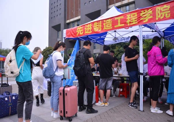 因疫情的特殊原因,我校堅持做到綠碼通行,禁止學生家長入校,以確保疫情期間學生的生命安全。同時先進制造工程學院還組織了一批迎新志愿者,合理的分配任務,以便更加有效的進行新生的迎新工作。在入校方面,志愿者們積極地從新生家長手中接過行李箱,帶領著新生到達各班級助理前辦理好入學手續,然后幫助新生領取生活用品與軍訓服裝,并將新生送至寢室,維持整個迎新現場的秩序。