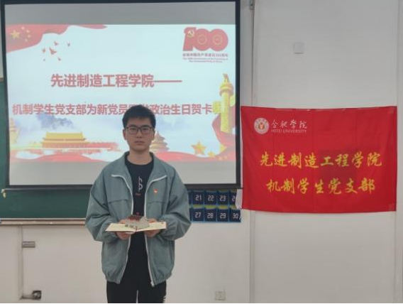 機制學生黨支部書記和支委會委員代表支部分別為6名正式黨員和25名新黨員送上了支部精心準備的帶有石庫門、天安門、紅船立體模型的3D“政治生日”賀卡,充分體現黨支部對黨員政治上的關心和精神上的鼓勵,同時也讓新黨員感受到黨支部的溫暖關懷。
