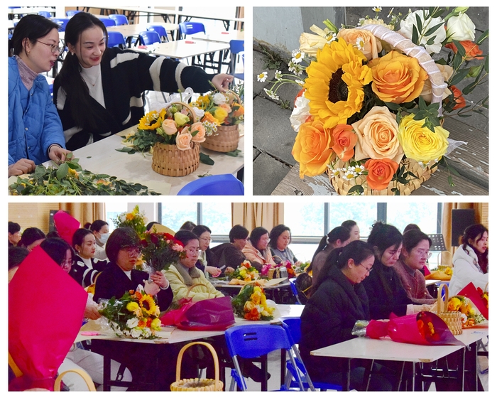 教職工活動室里,校工會主辦、經濟與管理學院分工會承辦的“魅力巾幗 花漾年華”主題插花活動正在如火如荼地舉行。活動現場,花藝師向大家介紹了鮮花的品種并詳細講解了插花的技巧與方法。教職工們充分發揮創造力,用靈巧的雙手完成了一束束插花作品,營造了濃厚的節日氛圍。