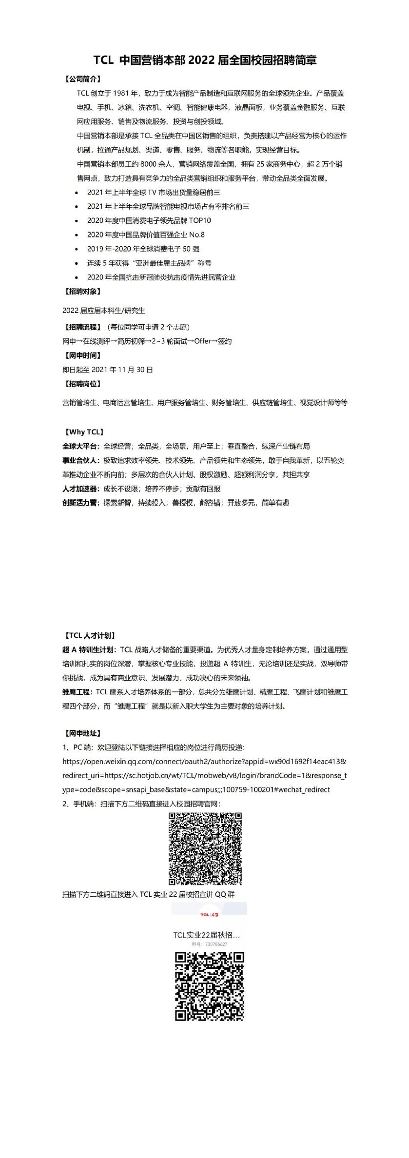 TCL中國營銷本部2022屆全國校園招聘簡章