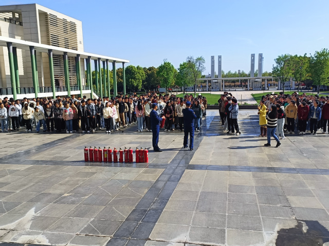 活動開始,學院模擬了火警報警信號。警報響起后,4號教學樓的全體師生根據指示快速有序地疏散到教學樓外開闊的地方,消防志愿者們維持著現場秩序。隨后單指導員為我院師生講解關于火災預防、滅火技巧、災害應對等方面的知識,并演示、講解了滅火器的使用方法,現場師生在指導員們的指揮下使用滅火器進行滅火訓練,提高了實踐操作能力。