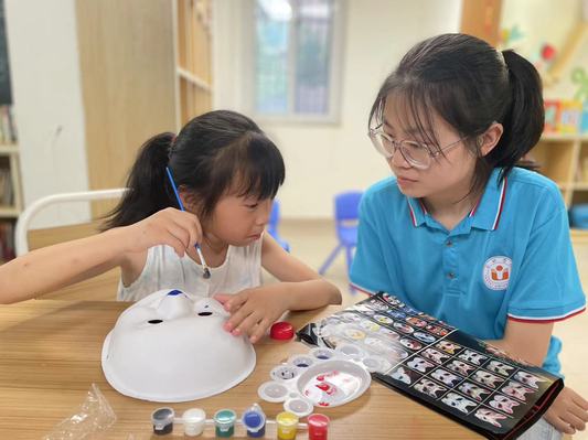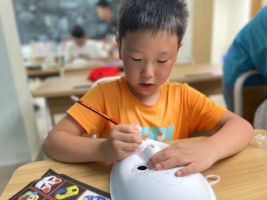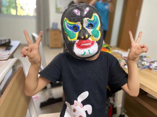 了解臉譜的歷史和不同顏色臉譜背后代表的寓意后,志愿老師開始教孩子們自己繪制臉譜。工作人員為大家分發了面具臉譜、顏料、畫筆等工具。準備工作完成后,志愿老師詳細地給孩子們介紹了京劇臉譜繪制技藝、制作步驟等知識,講解了不同臉譜的繪畫方法,以及如何用畫筆勾勒線條、暈染顏色。孩子們用鮮艷的色彩在空白的臉譜胚上繪制紛繁復雜的圖案,或是細筆勾勒,或是豪放潑灑,畫筆下生出奇思妙想,將京劇傳統臉譜與自己的創意相結合。一張張極具孩子們個性特征的京劇臉譜在他們筆下呈現,一筆一畫都精細流暢,每個神情姿態都不一樣,絢麗多彩,令人贊嘆。每個人都在驕傲地展示自己的作品。孩子們將臉譜面具用繩子穿好,戴在自己臉上,學著京劇里的段子有模有樣地比劃著,教室里一片歡聲笑語。孩子們在課下的采訪中表示非常喜歡這節課,有趣的臉譜繪制打破了他們對京劇晦澀難懂的傳統印象,讓他們對非遺文化產生了濃厚興趣。