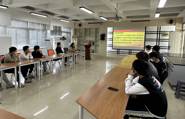 5月8日,為扎實做好2023年度大學生征兵工作,使同學們進一步了解大學生應征入伍的相關優待政策,鼓勵和引導大學生積極應征入伍,激發學生報效祖國的熱情,征兵辦鄭國平老師來我院開展2023屆畢業生征兵宣講。旅游與會展學院黨委副書記孫靜宇、畢業班輔導員董敏、戴路以及部分畢業生參加本次會議。