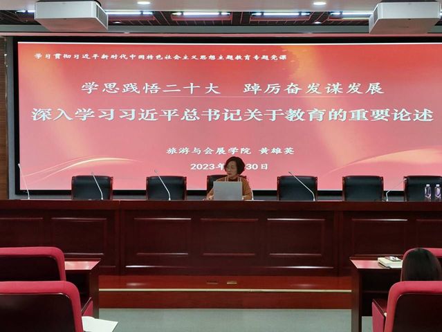 根據《旅游與會展學院學習貫徹習近平新時代中國特色社會主義思想主題教育理論學習工作安排》,5月30日下午,旅游與會展學院黨委書記黃雄英“學思踐悟二十大  踔厲奮發謀發展---深入學習習近平總書記關于教育的重要論述題,為全體師生黨員講授主題教育專題黨課。