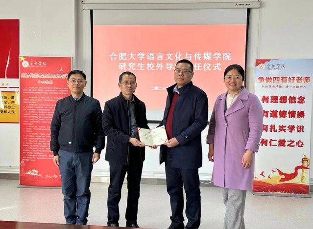 為進一步推進人才培養和學術研究工作,提升碩士研究生培養質量,拓展研究生培養資源,完善協同育人機制,12月7日,語言文化與傳媒學院于一區善思樓C座大會議室順利舉行了研究生校外導師聘任儀式。安徽省安策智庫創始人陳丹、語言文化與傳媒學院院長丁增武、院黨委副書記張愛萍、副院長殷明明出席此次聘任儀式。